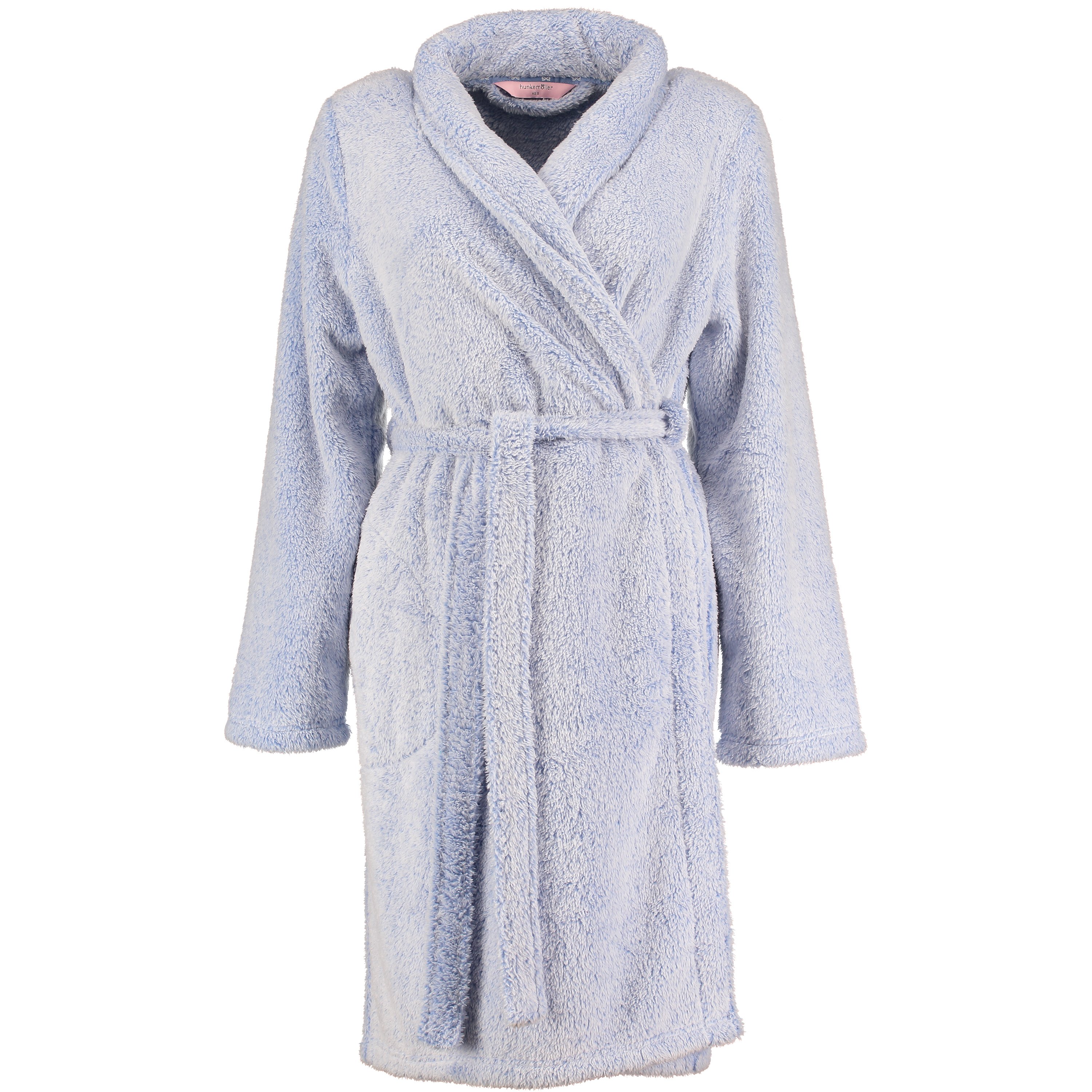 This lovely soft bathrobe is grey with a broad collar and a tie sash at the waist.