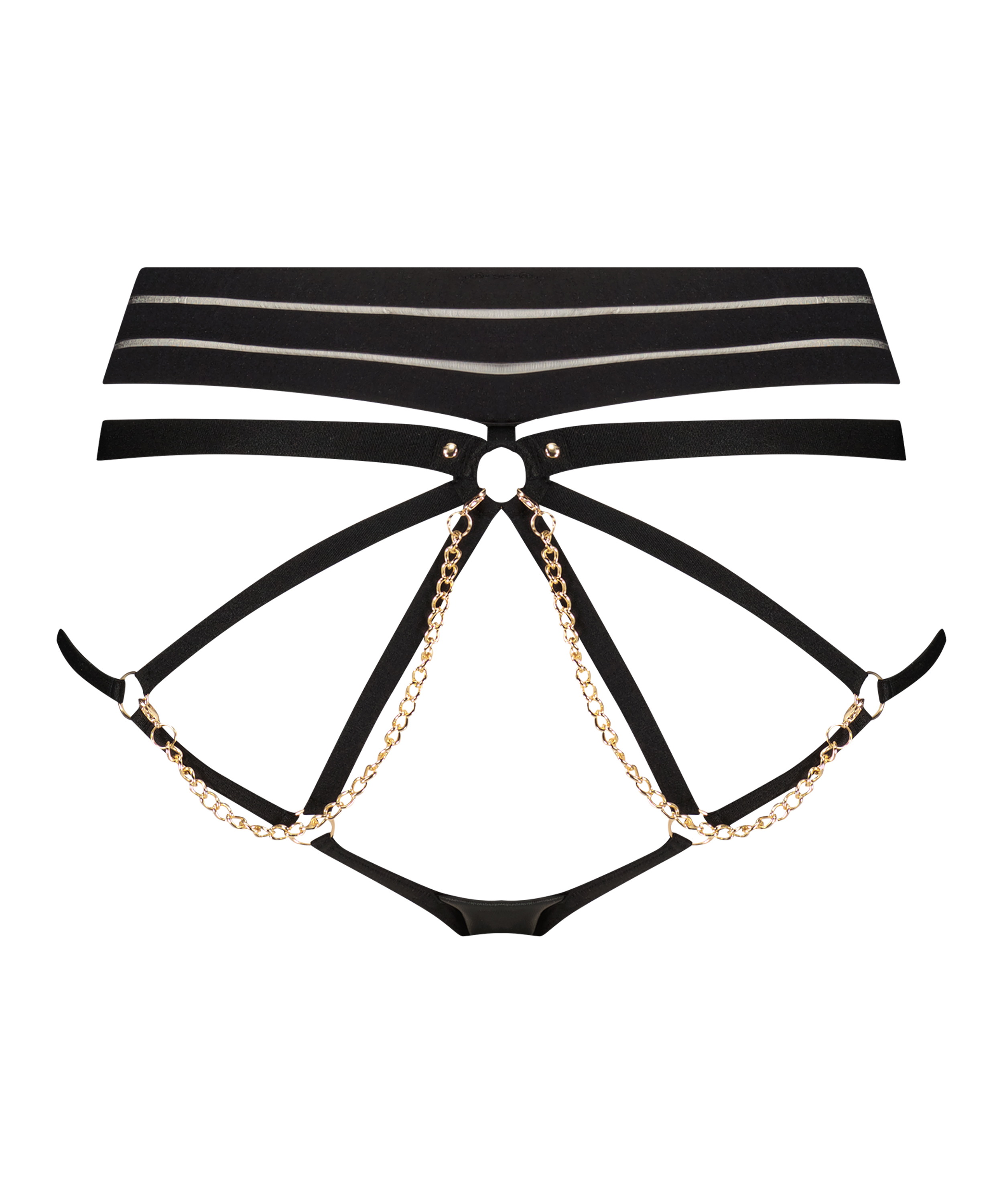 Ta ditt underklädesset till nästa nivå med denna supersexiga brazilian-trosa! Dekorerad med banddetaljer och avtagbara guldkedjor för en het look. Det finns en utskuren detalj på baksidan och stringtrosan är dekorerad med en avtagbar guldkedja. Matcha med Hecate bustier för ett komplett set!