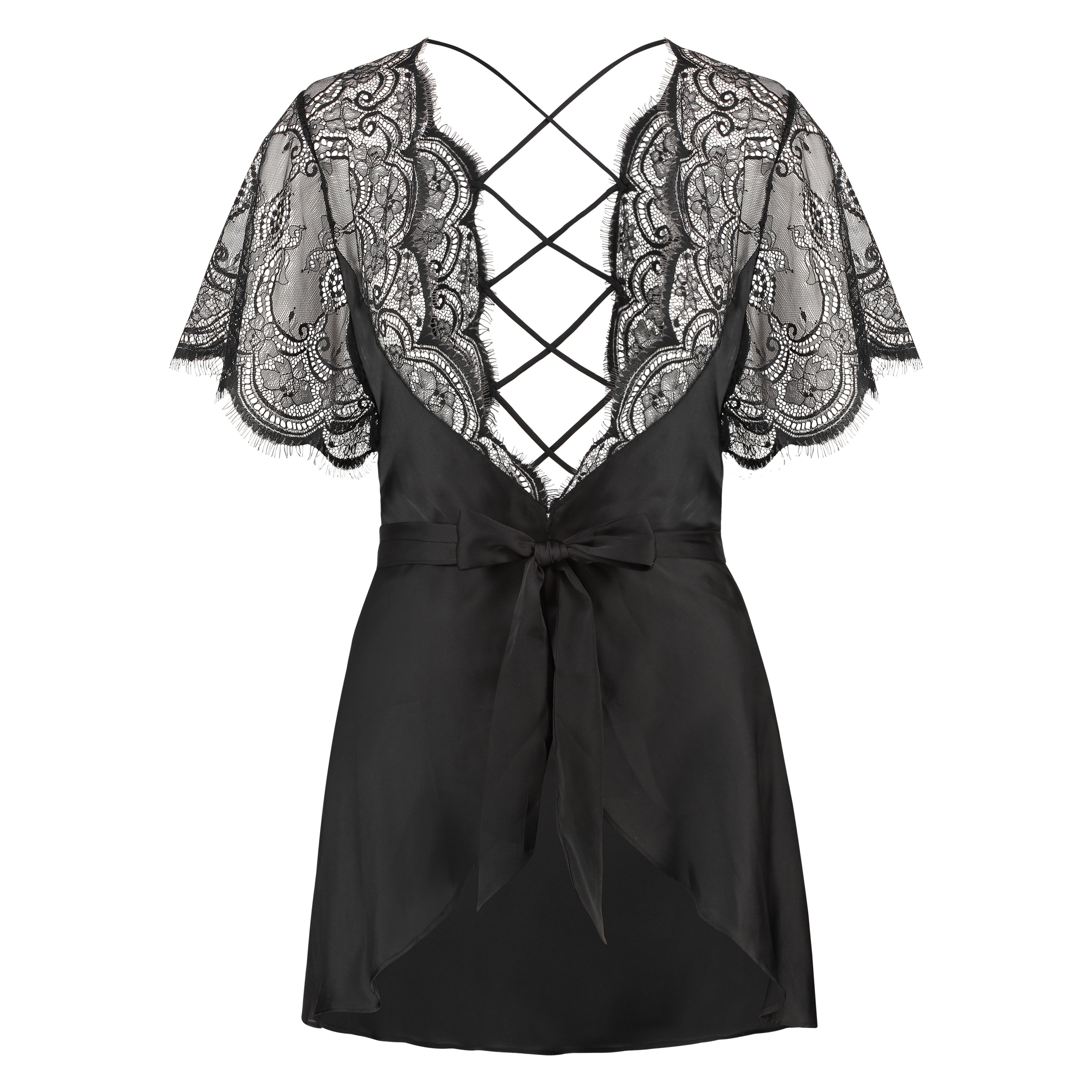 Sexig kimono med halvtransparent spets och mesh. Denna kimono har korta ärmar och en elegant stängd rygg. En del av den privata samlingen.