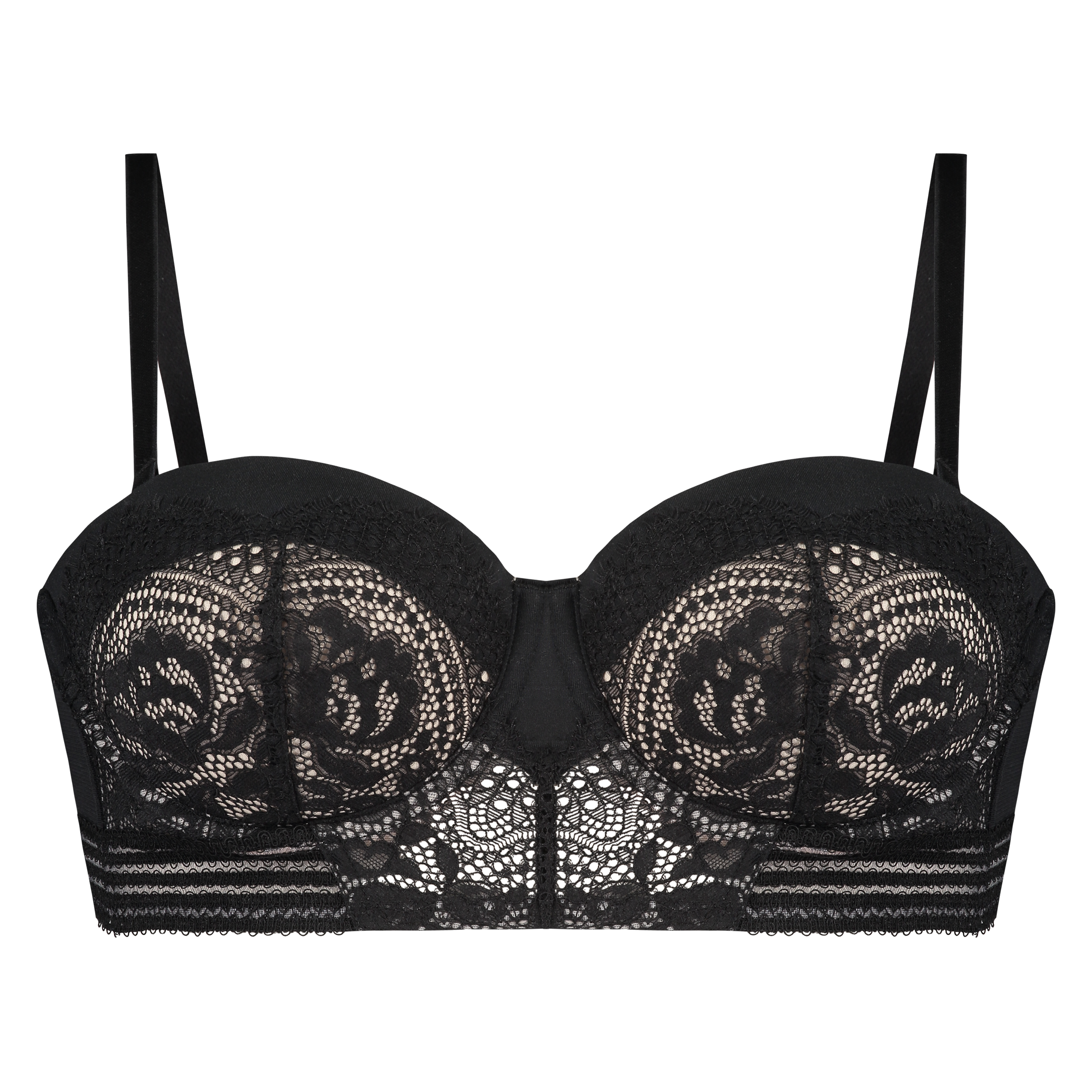 Du känner dig riktigt sexig i denna longline-bh! Denna bh har massor av spetsdetaljer. Den kan även bäras axelbandslöst, perfekt för alla tillfällen! Kombinera med de matchande trosorna!