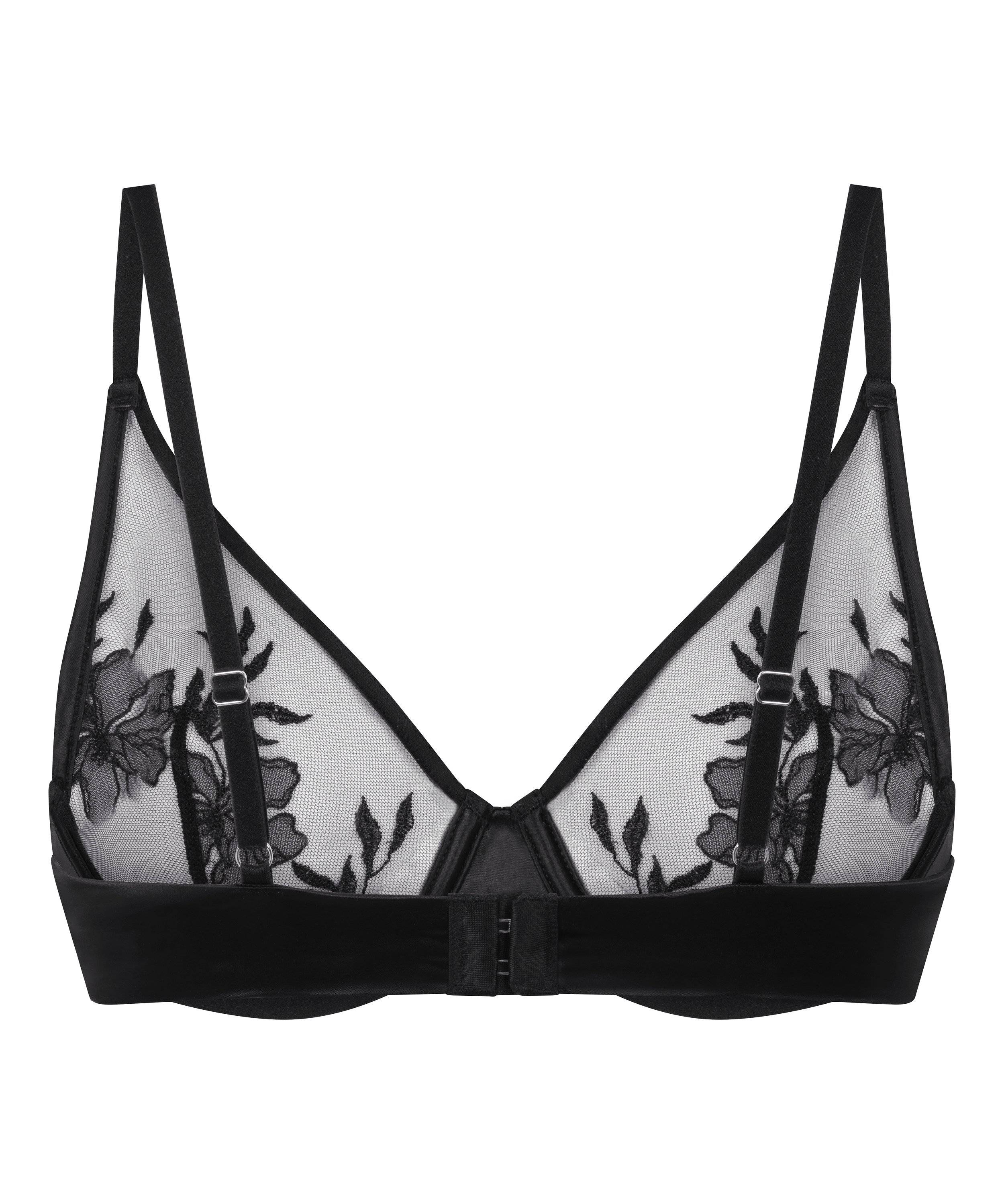 Den här bh:n är både fin och djärv och är designad för att fira din naturliga form med en touch av romantisk elegans. Meshkuporna är prydda med invecklade blombroderier, vilket skapar en mjuk, feminin look som känns lika vacker som den ser ut. Den djupa V-ringningen framhäver ditt dekolletage, medan bygelkuporna ger diskret lyft och stöd utan extra vaddering. Kombinera med dina favorittrosor för en komplett look.