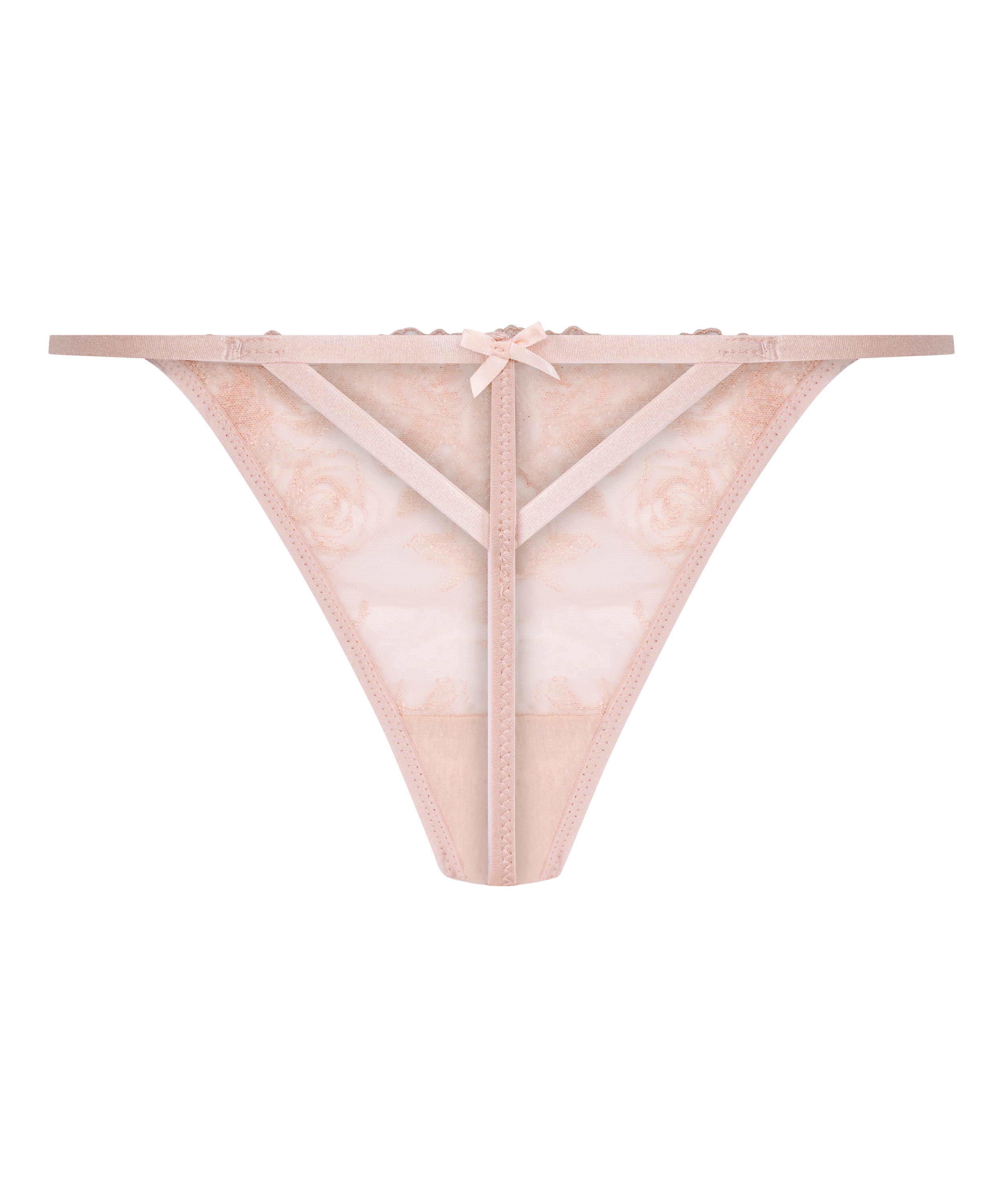 Flörtig och feminin – den här stringtrosan är designad för att framhäva dina kurvor med en touch av romantisk charm. Den är tillverkad av mesh och har broderade blommor som ger struktur. De högt skurna benen förlänger din siluett, medan rosetterna på varje sida ger en lekfull finish. Kombinera med matchande bh för en komplett look.