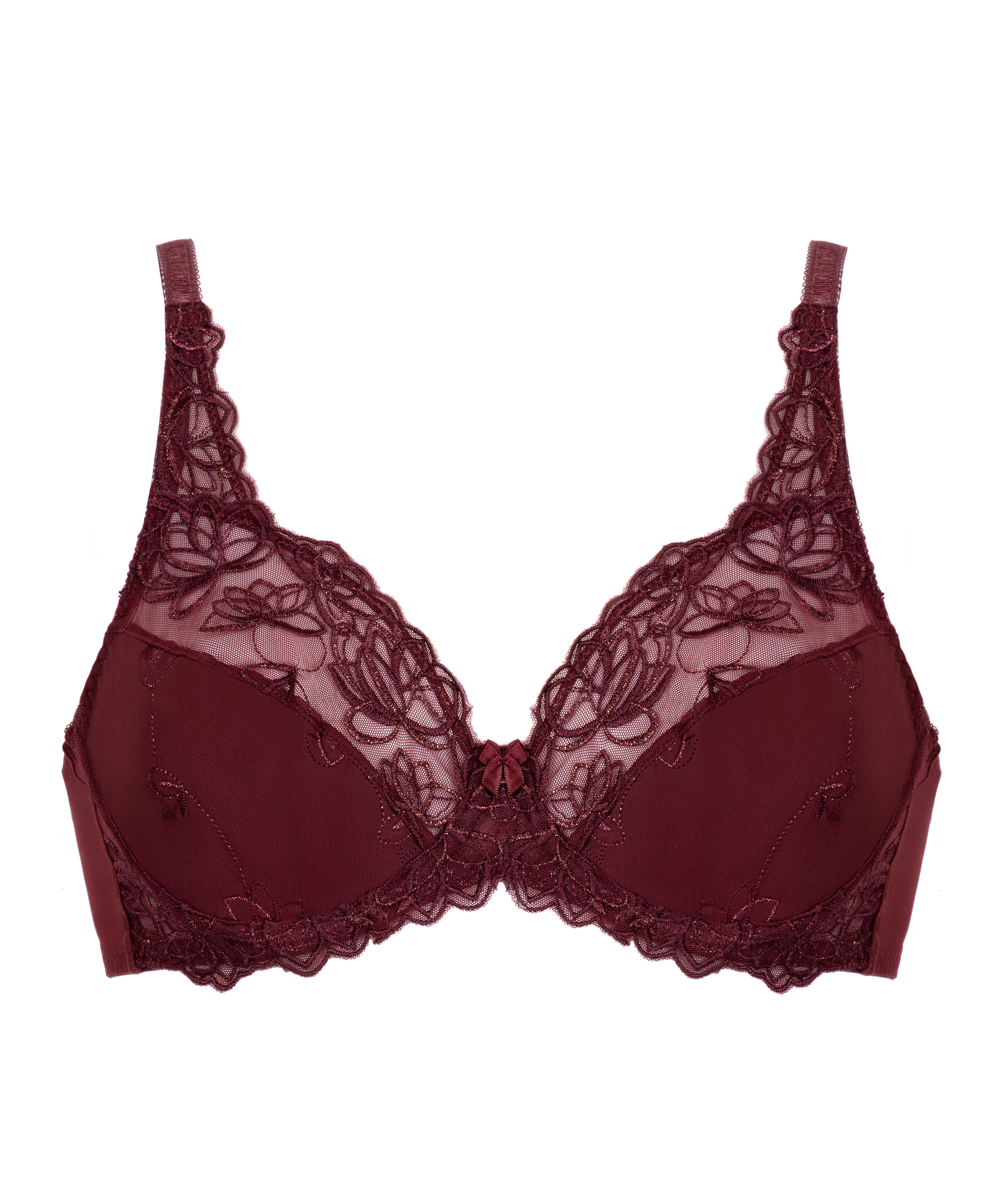 Denna icke-formpressade bygel-bh är sydd i ogenomskinligt tyg med halvgenomskinlig spets längs kanterna. Kuporna är vackert utsmyckade med ett elegant blomstermönster. Gör setet komplett med den matchande Diva-trosan.