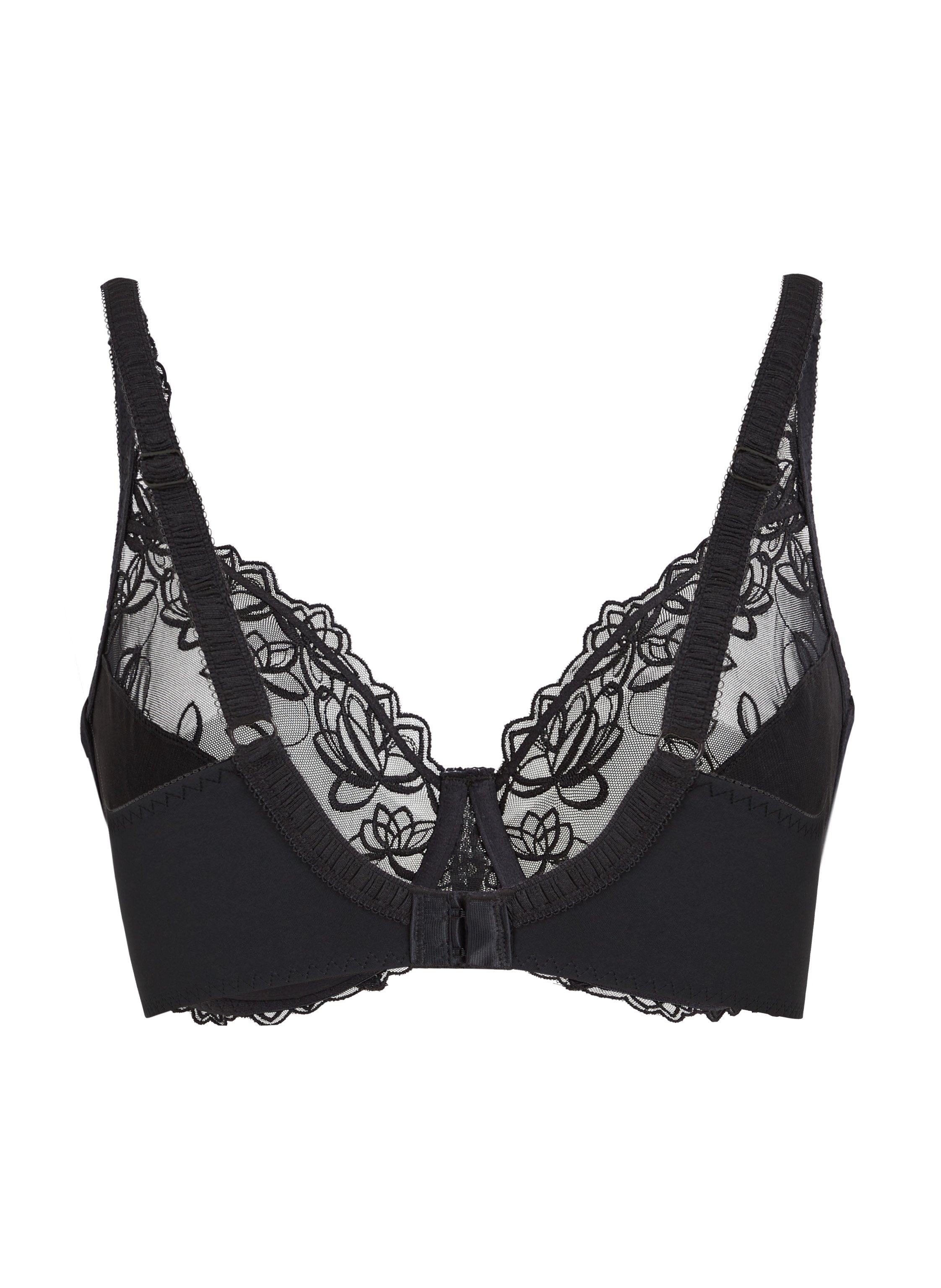 Denna icke-formpressade bygel-bh är sydd i ogenomskinligt tyg med halvgenomskinlig spets längs kanterna. Kuporna är vackert utsmyckade med ett elegant blomstermönster. Gör setet komplett med den matchande Diva-trosan.