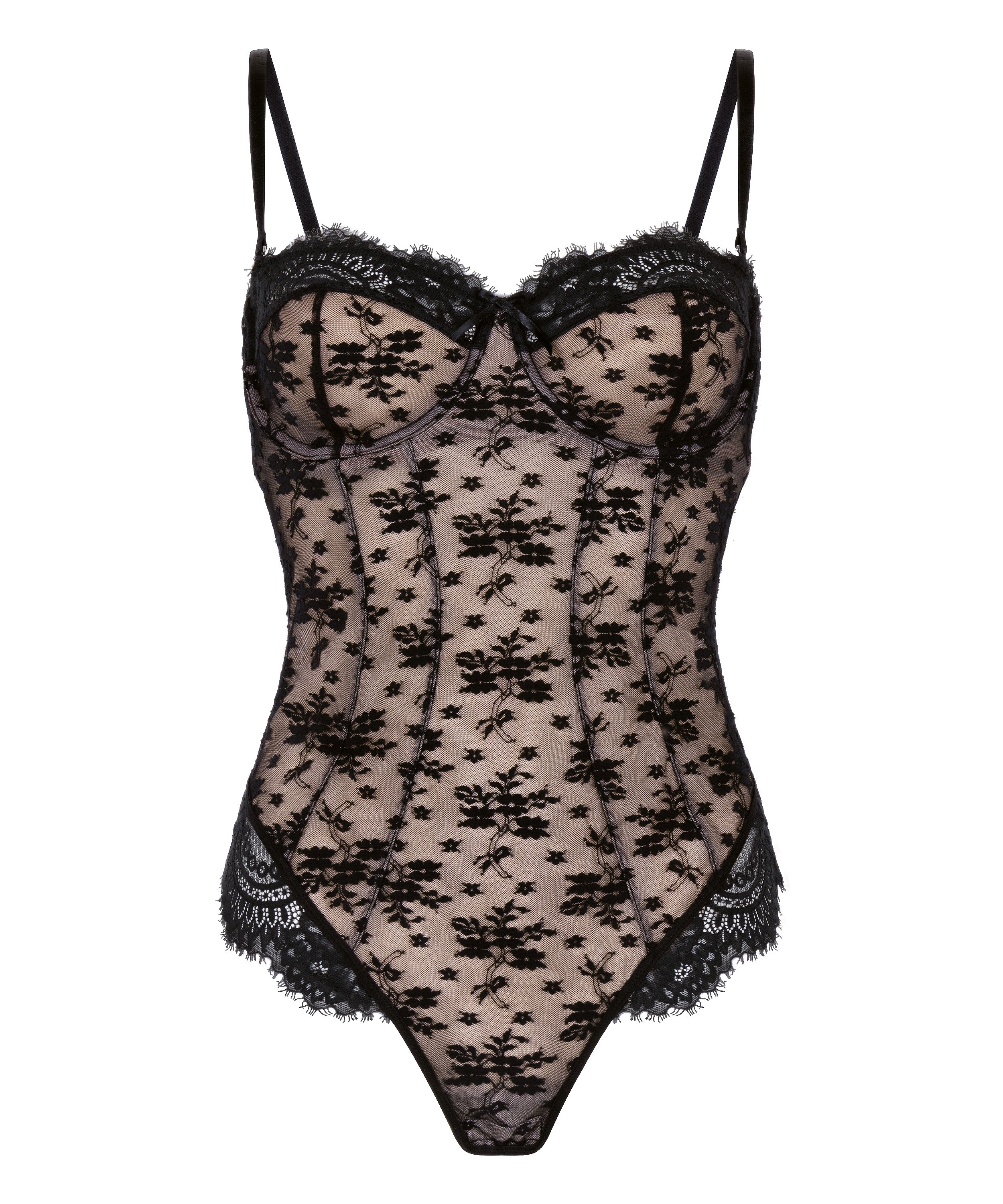 Romantisk och raffinerad – denna body i spets är designad för att framhäva din naturliga siluett med detaljer och genomtänkt struktur. Den har icke-formpressade kupor med bygel och ger en slät silhuett med mjukt lyft. Spetsen omsluter kroppen i elegans, medan de avtagbara axelremmarna gör att du enkelt kan växla mellan klassisk och axelbandslös stil.