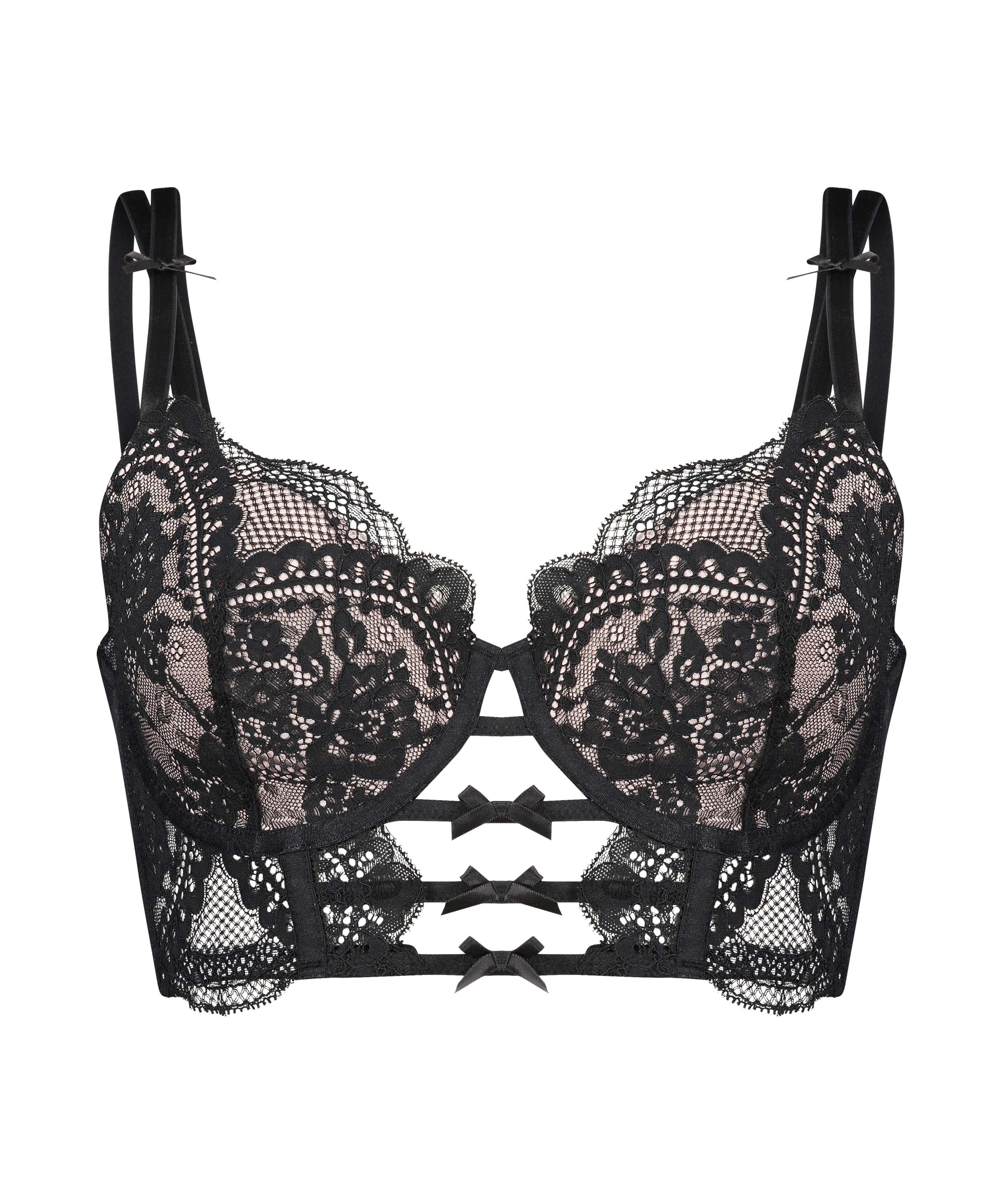 Elegant formpressad longline-bh med bygel Behån har mycket spets plus rosetter som extra skojiga detaljer. Kombinera med matchande trosor för ett komplett set. Del av Rebecca Mir-kollektionen.