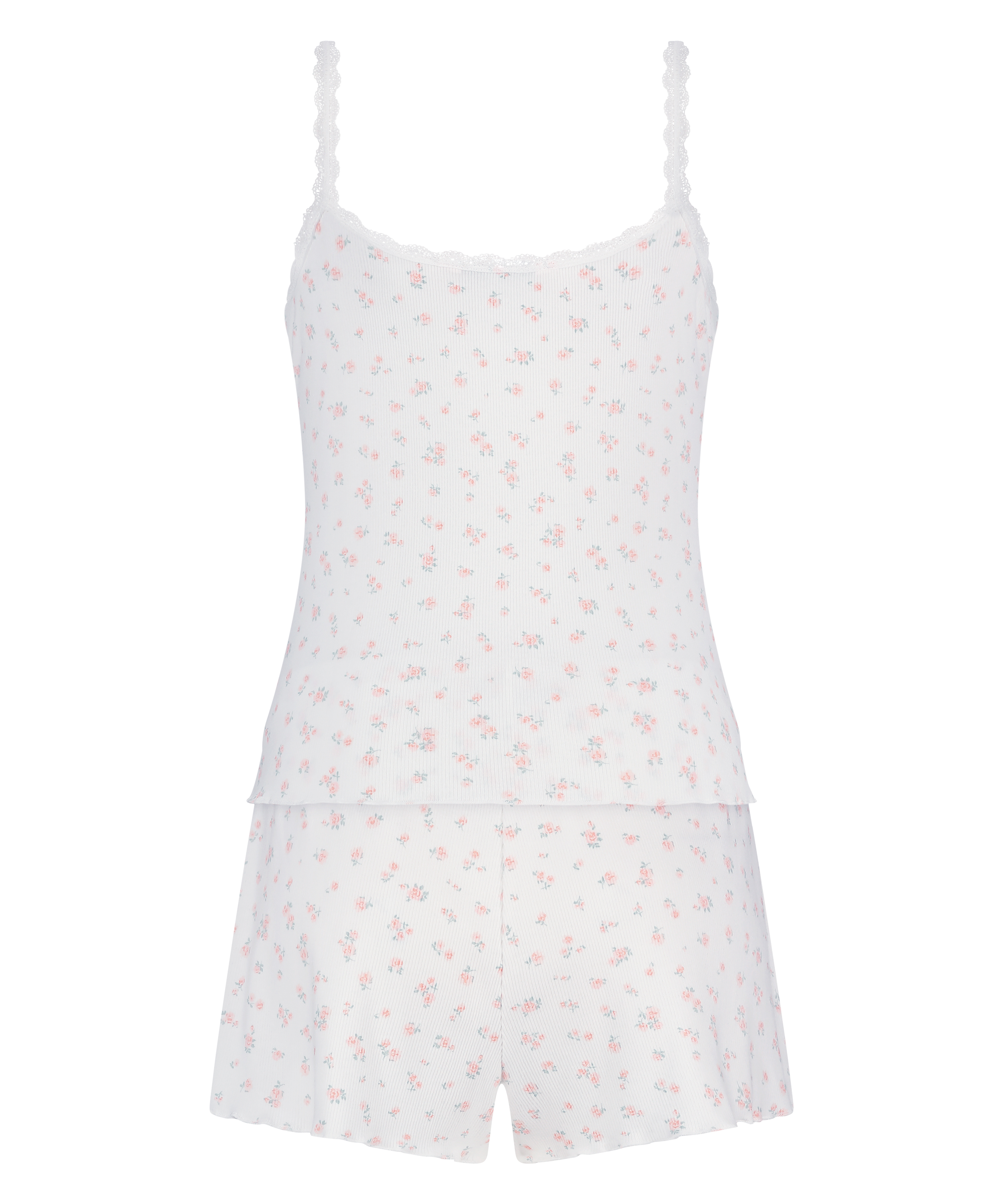 Uppgradera nattklädesgarderoben med detta pyjamasset. Detta tvådelade set innehåller en mjuk, ribbad topp och matchande shorts, allt för en ledig och bekväm passform. Toppen har spetsdetaljer i halsen, vilket ger den mysiga designen en feminin touch.