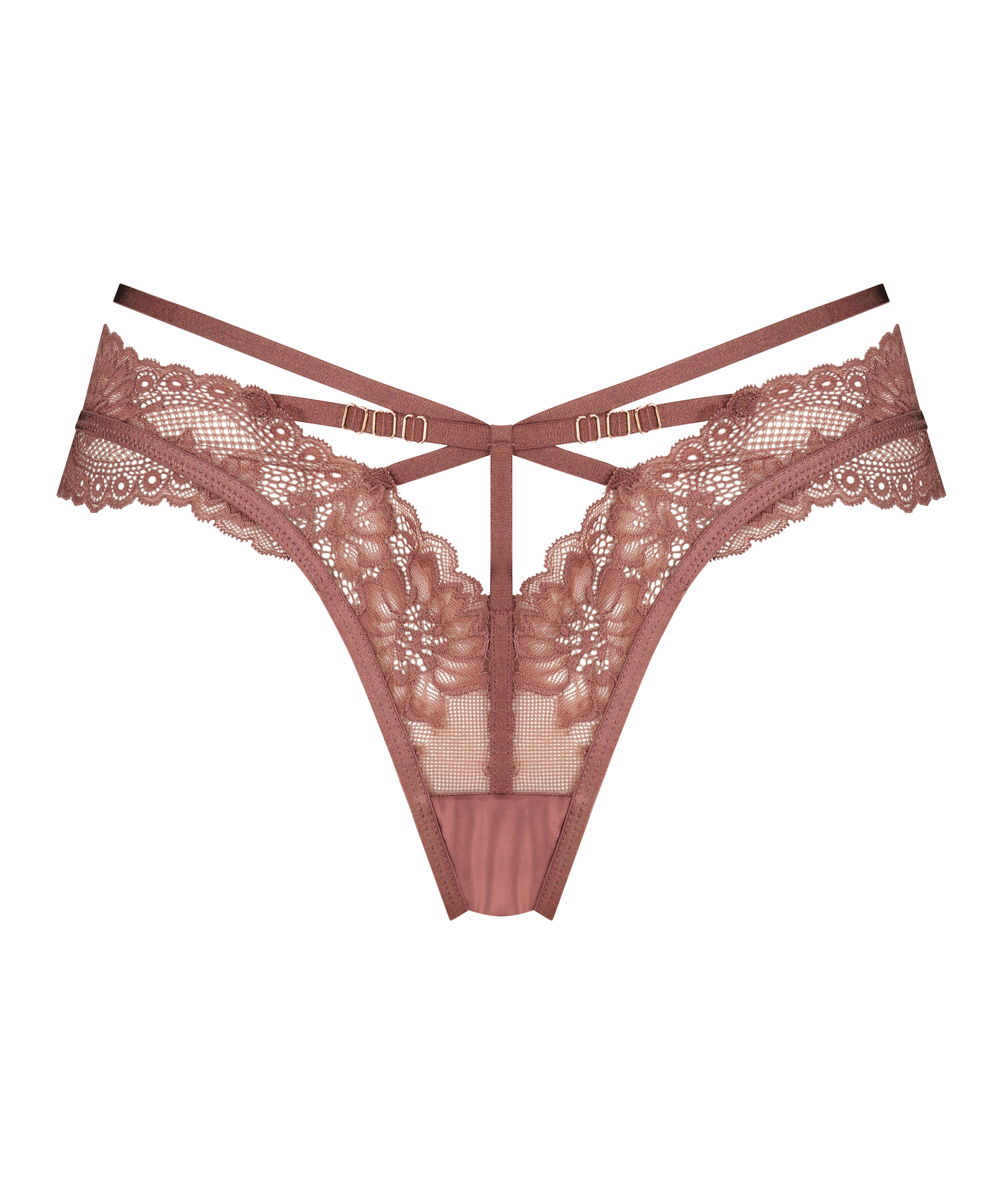 Missa inte denna sexiga stringtrosa! Med en heltäckande spetslook på fram- och baksidan, med massor av banddetaljer och gulmetall. Komplettera setet med en matchande bh.