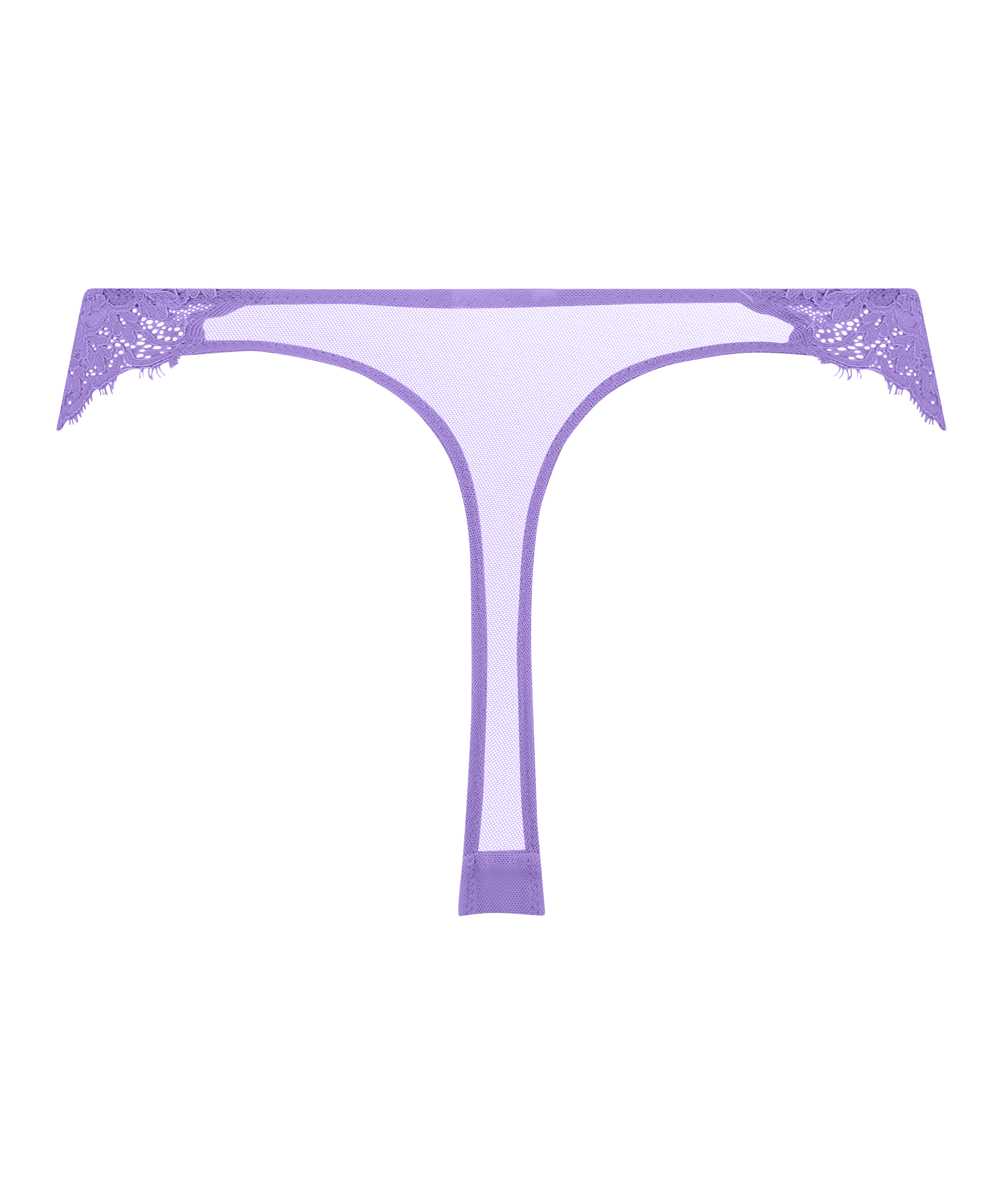Trendig stringtrosa gjord i genomskinlig spets framtill och mesh baktill. En liten knapp i mitten av fronten sätter pricken över i:et.
