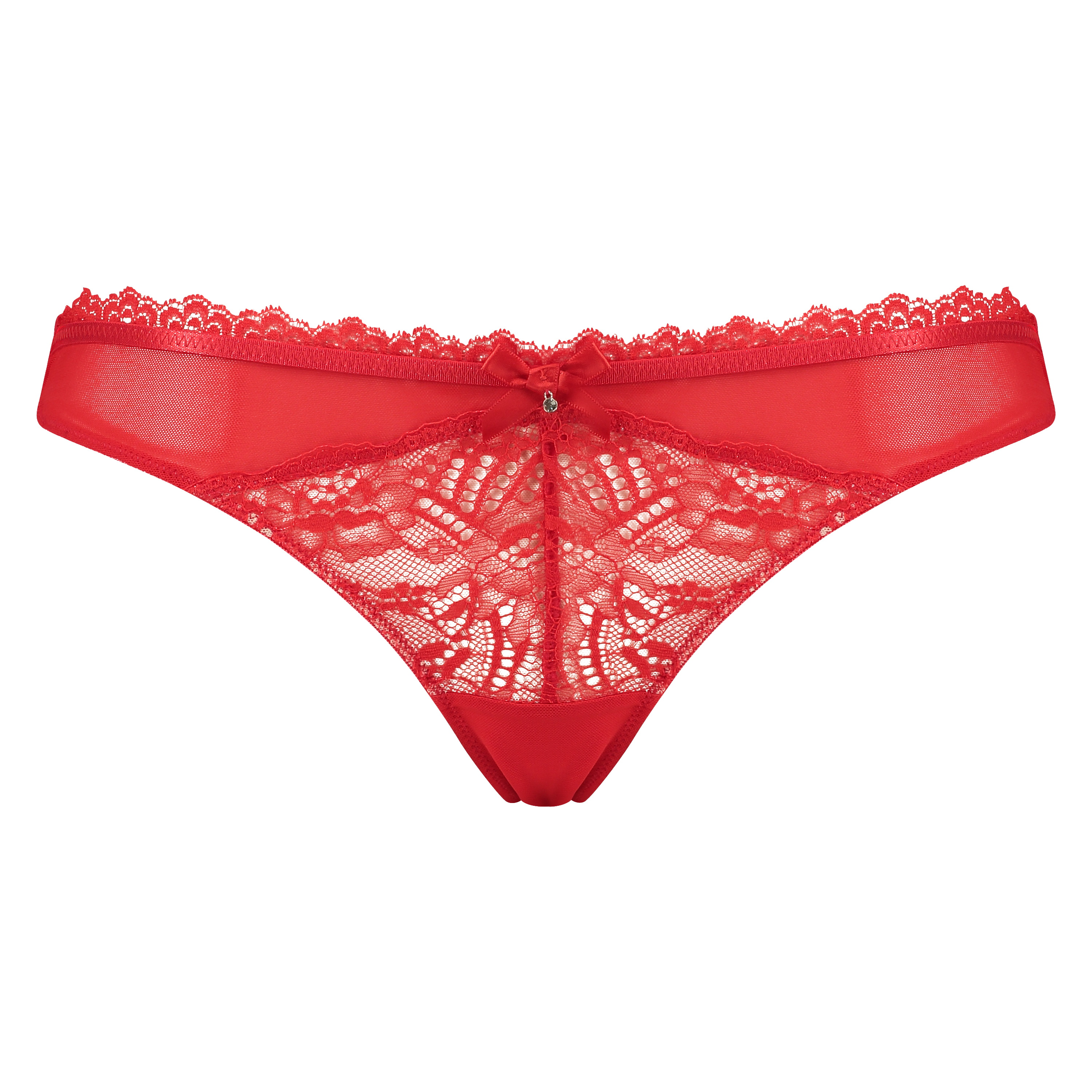 Sexig stringtrosa som är gjord i halvgenomskinligt tyg med vackert spetsmönster, dekorerad med en liten rosett med en gnistrande sten framtill.